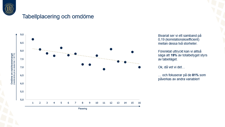 Förklaring till bilden ovan: UI genomför publikundersökningar på samtliga arenor inom Svensk Elitfotboll och ser i våra studier att den ”sportsliga dimensionen” förklarar ca 19% av publikupplevelsen och att hela 81% förklaras av andra parametrar. Det är dessa 81% som Josefine har arbetat med och som verkligen har gjort skillnad hos Blåvitt.